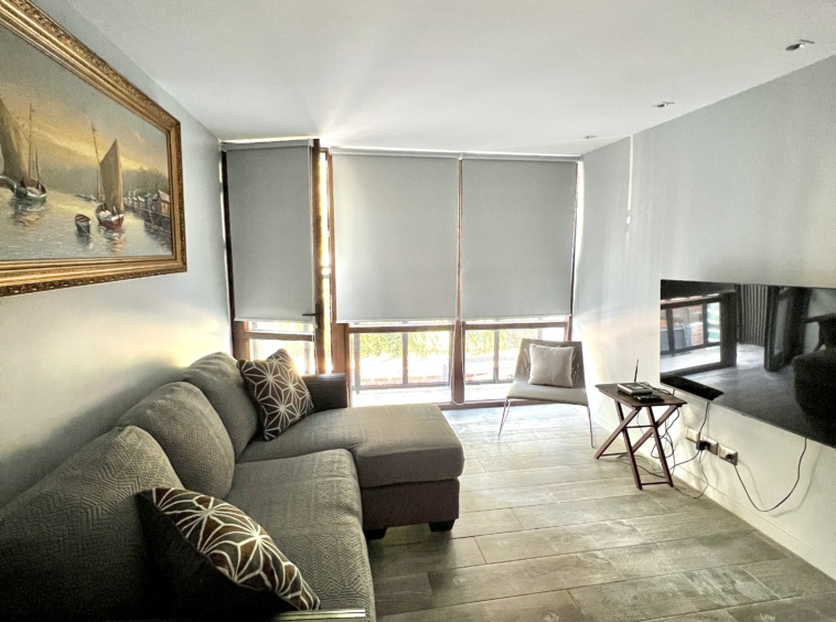 Sala de estar con sofá cama de dos plazas, Smart TV + TV Cable, escritorio de trabajo y cortinas roller black-out