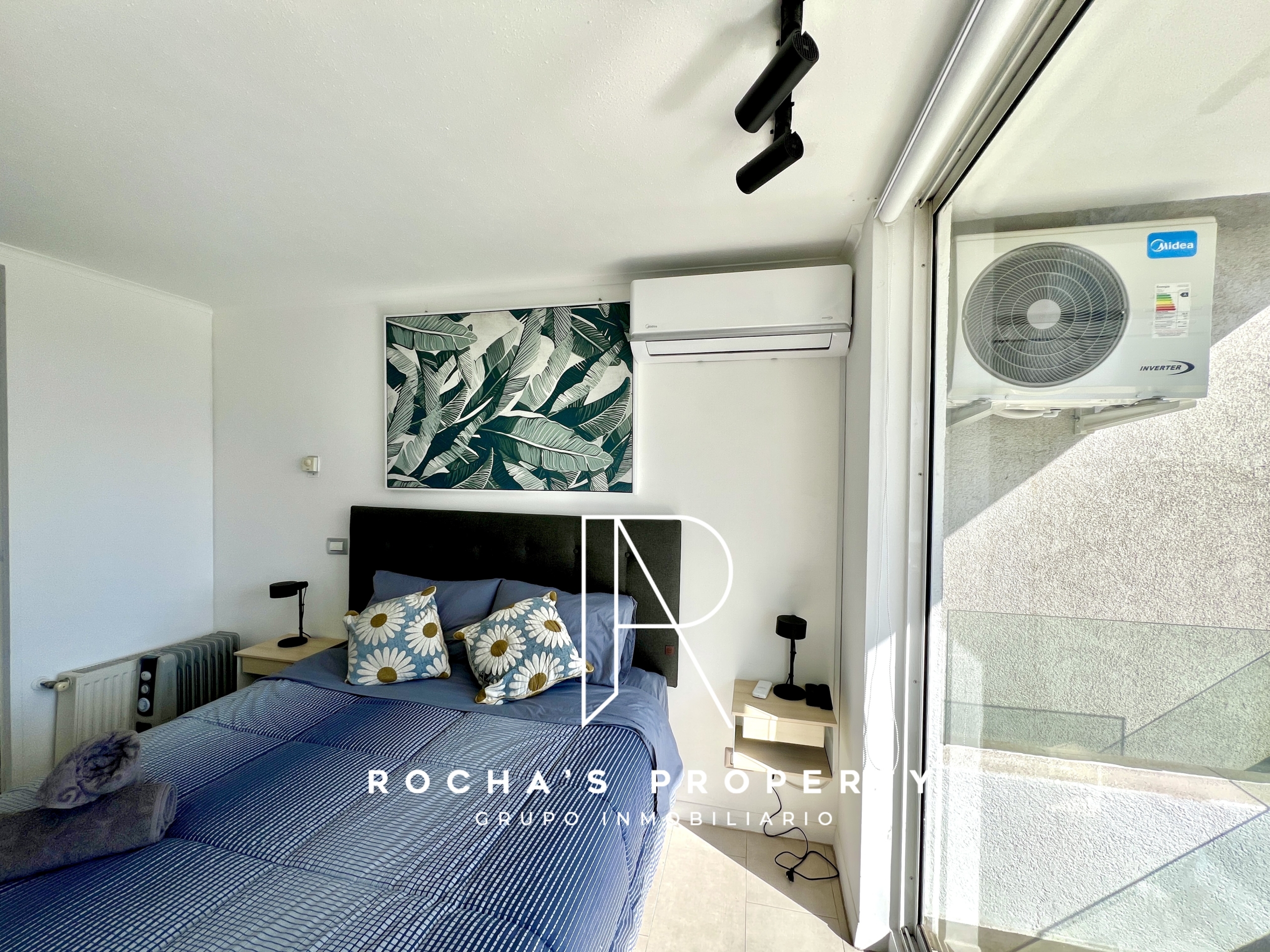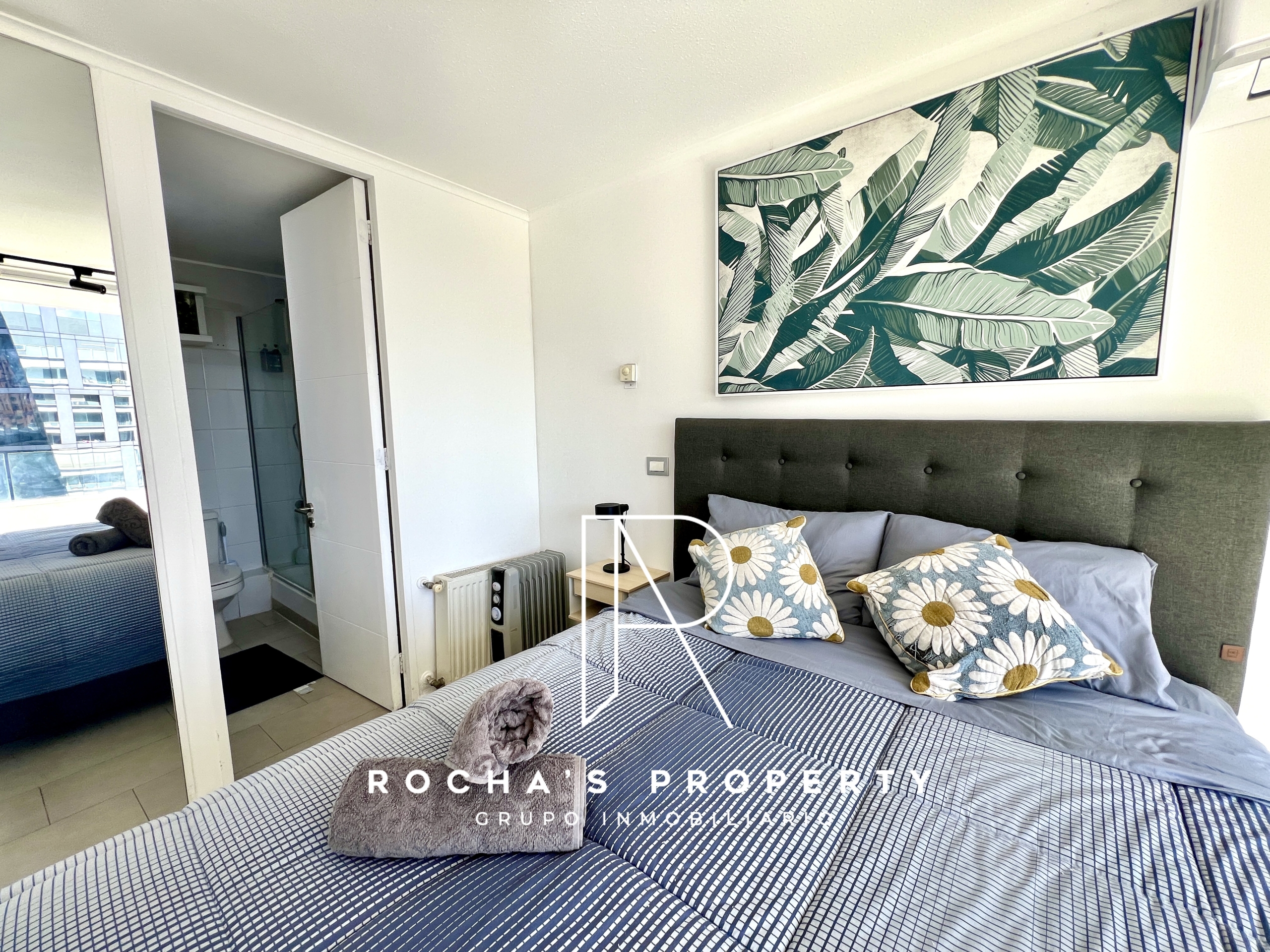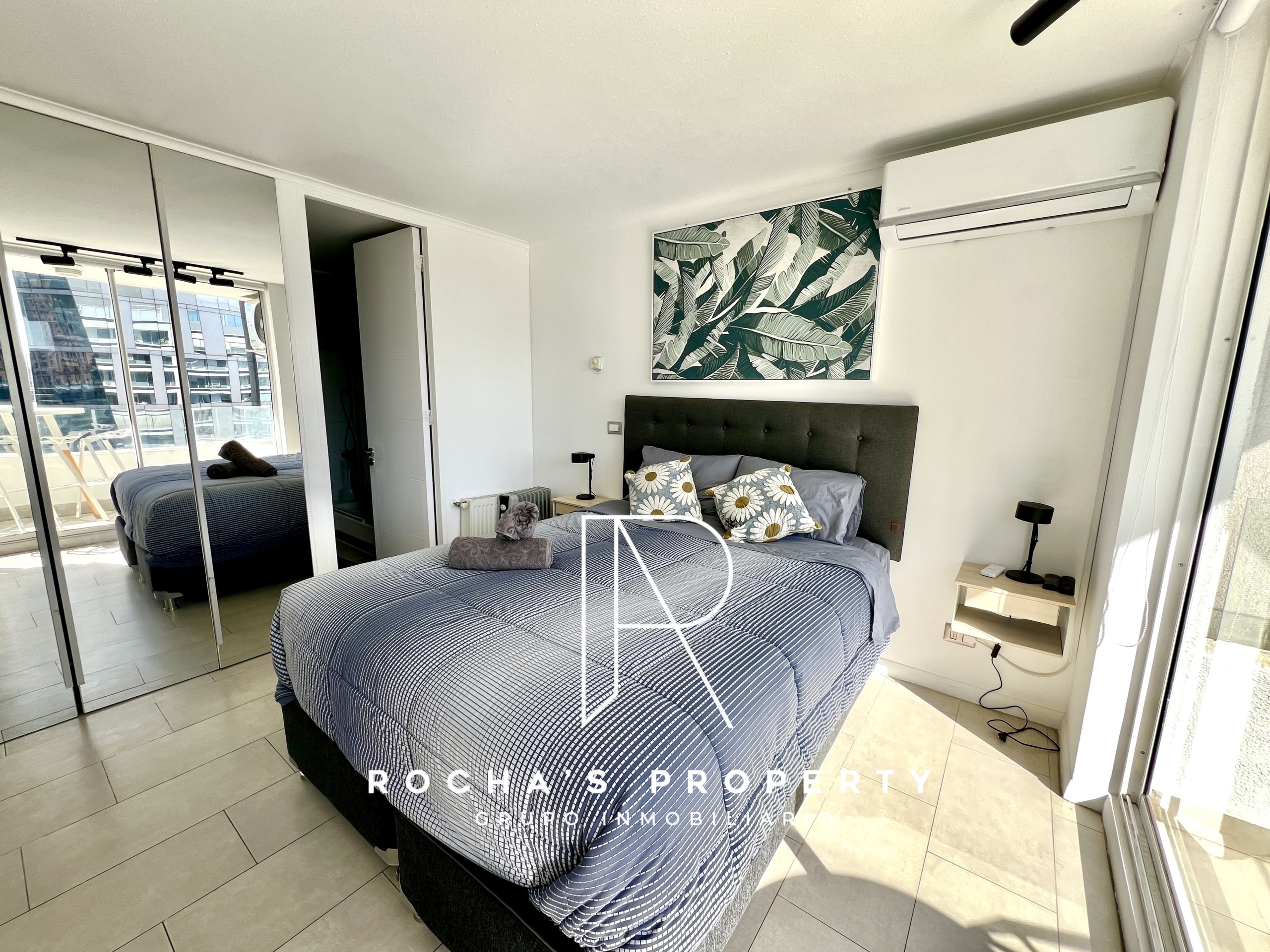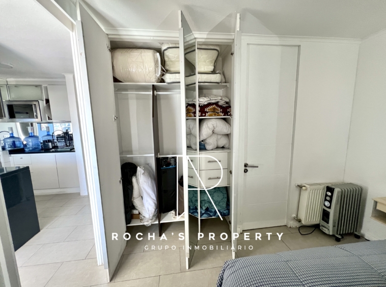 Este cómodo departamento cuenta con 1 dormitorio amplio en suite, con cama queen, acceso a la terraza, ropa de cama, amplio closet, televisor y aire acondicionado.