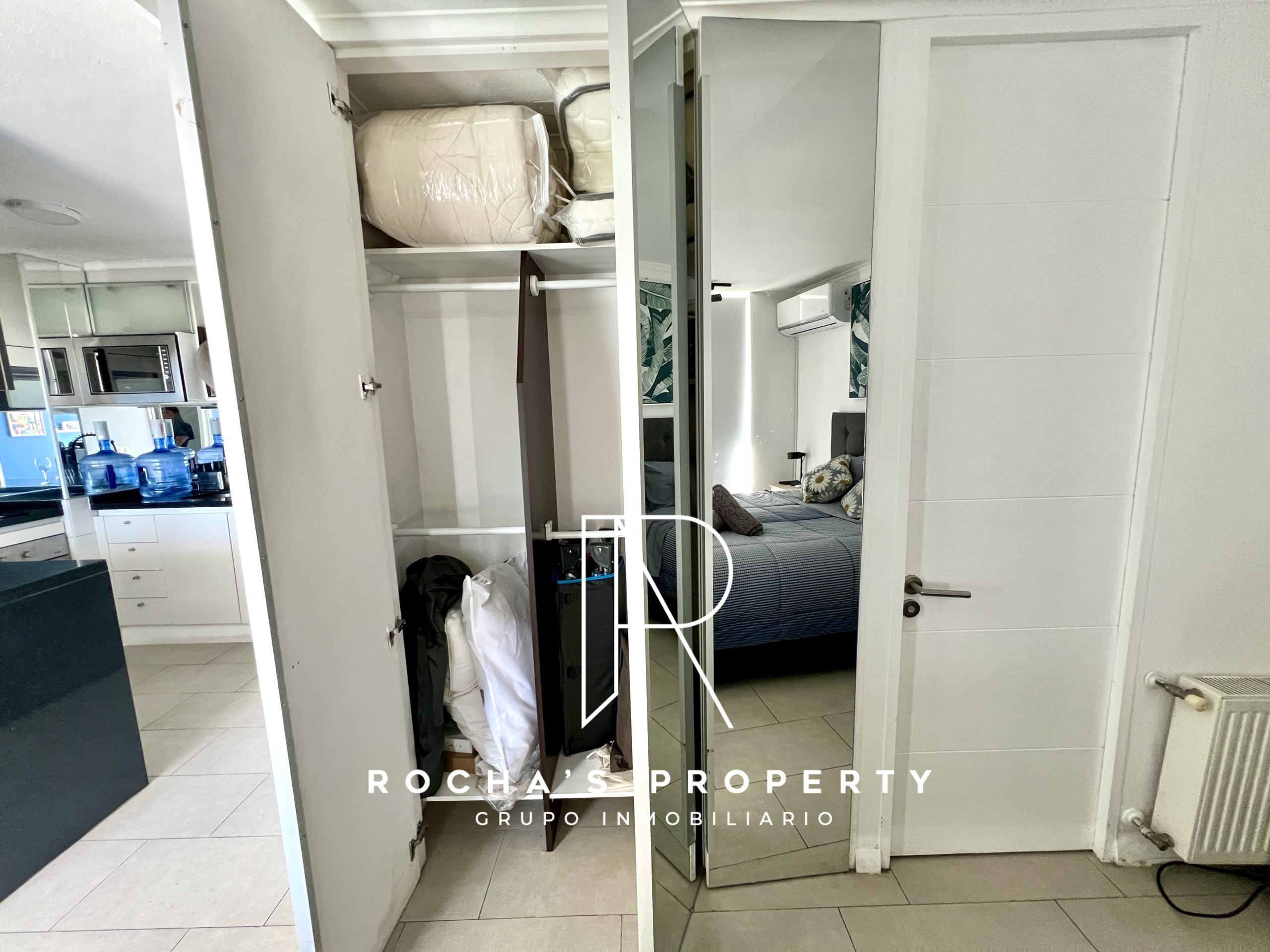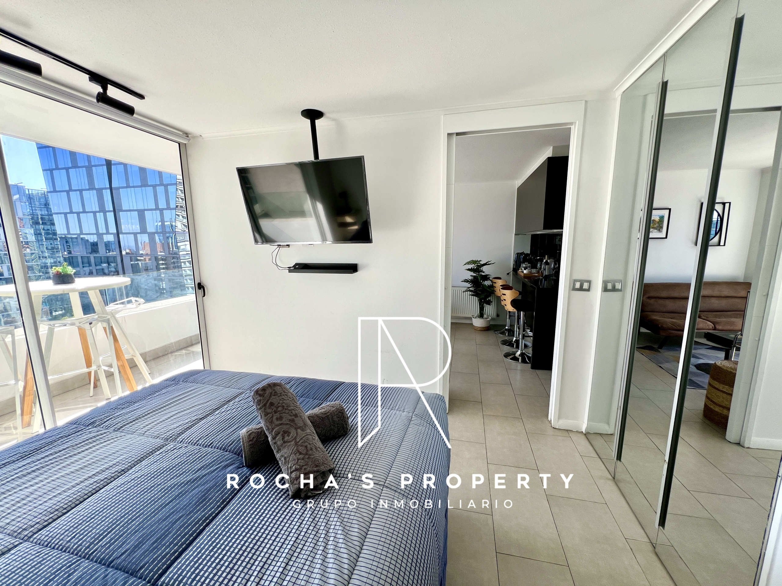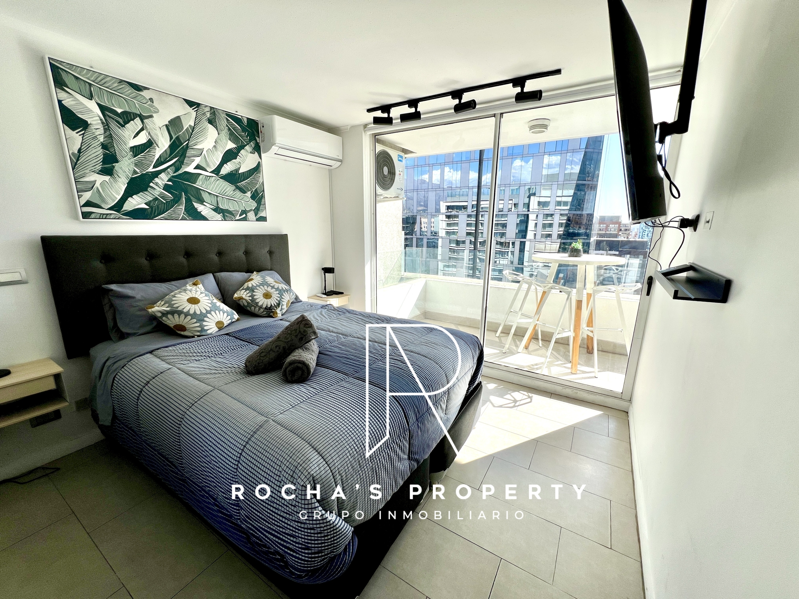 Este cómodo departamento cuenta con 1 dormitorio amplio en suite, con cama queen, acceso a la terraza, ropa de cama, amplio closet, televisor y aire acondicionado.