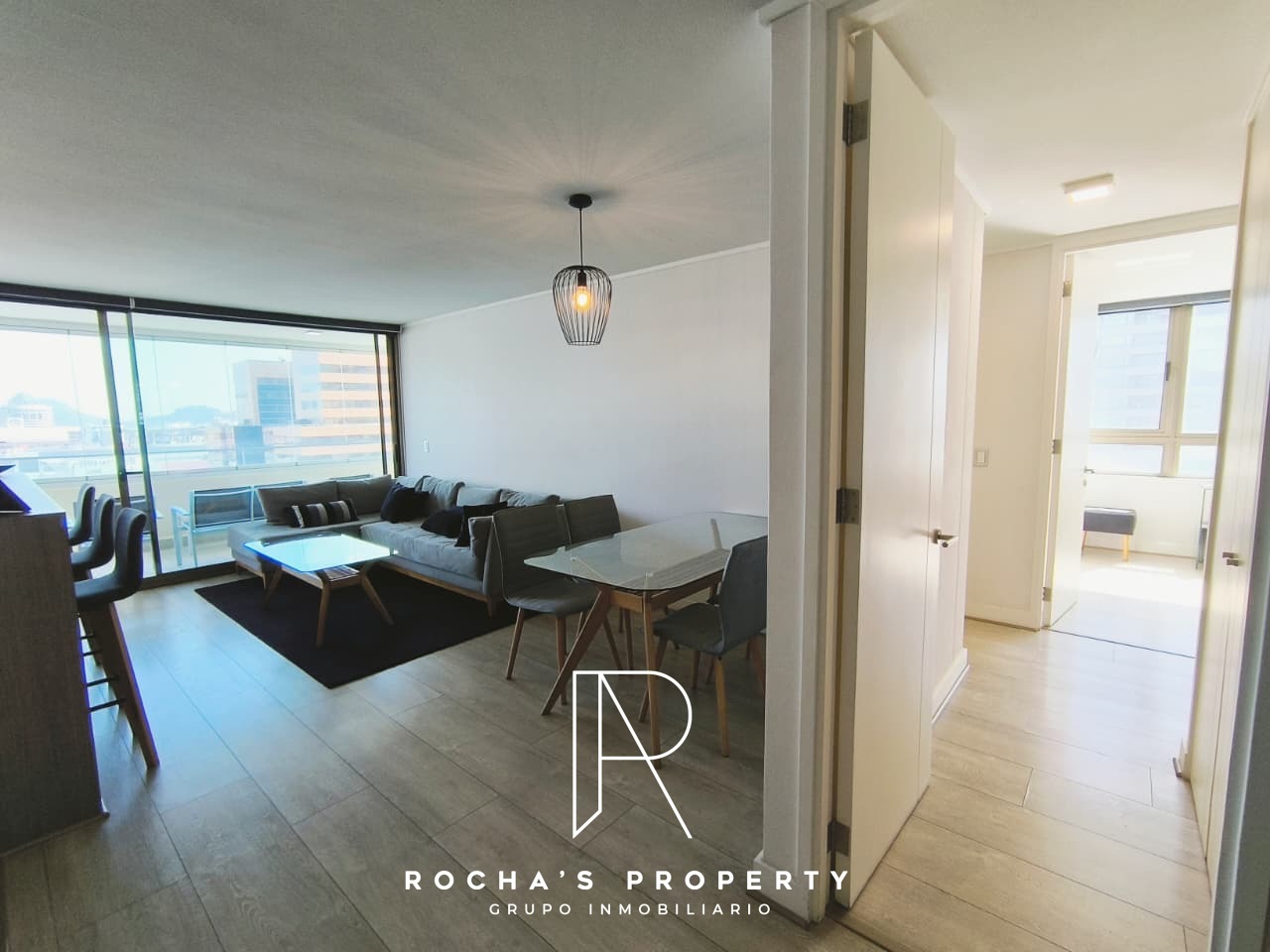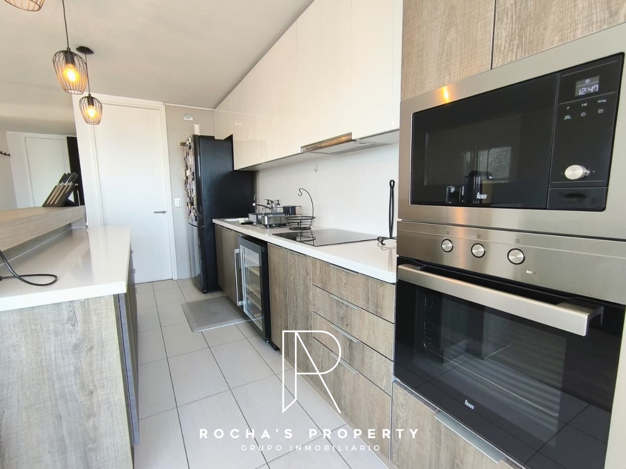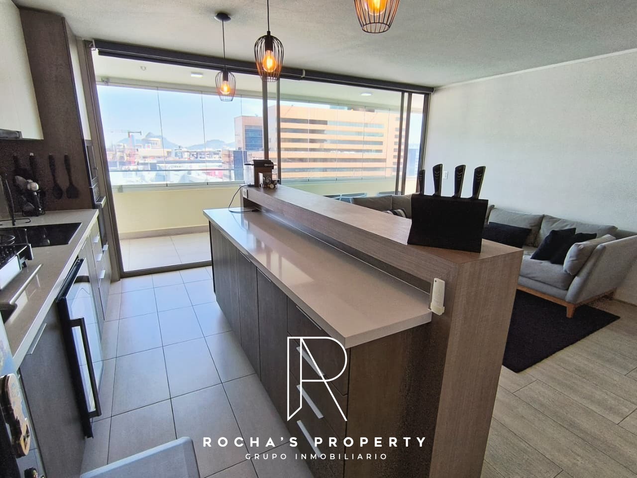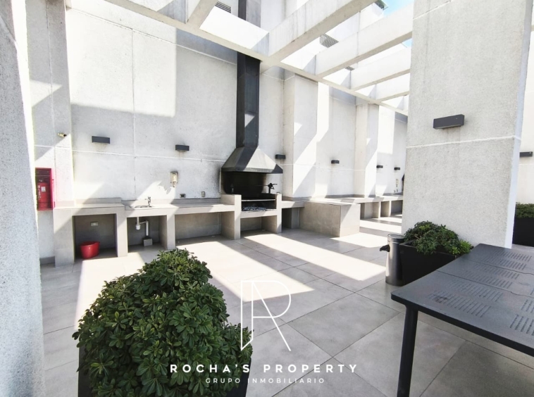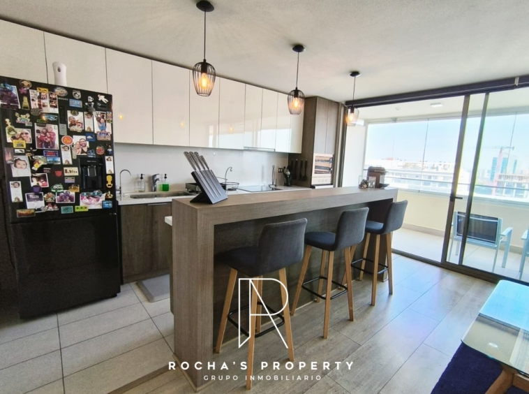 El departamento cuenta con un dormitorio principal en suite, equipado con un walk-in closet, ideal para mantener todo organizado. Además, tiene otro dormitorio con clóset y un baño separado. La cocina integrada con isla es moderna y funcional, acompañada de un refrigerador. El living comedor se abre a una gran terraza de 20 metros cuadrados con vista libre, perfecta para disfrutar de momentos al aire libre.