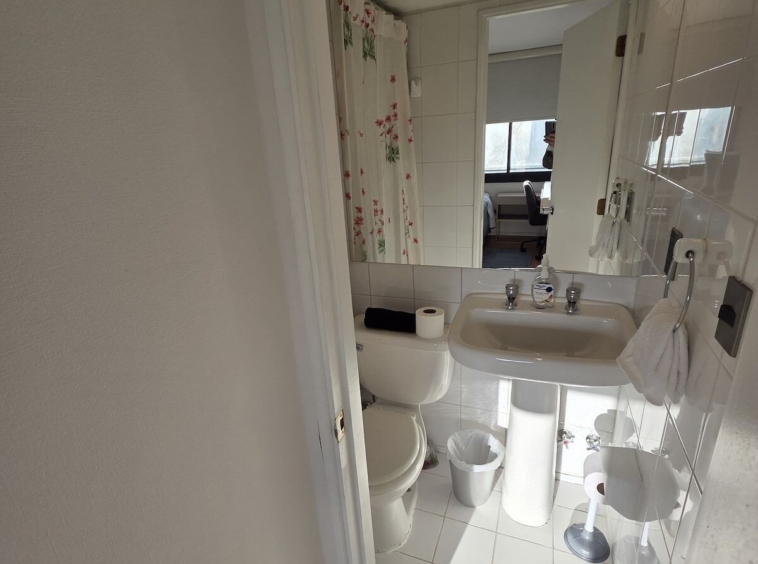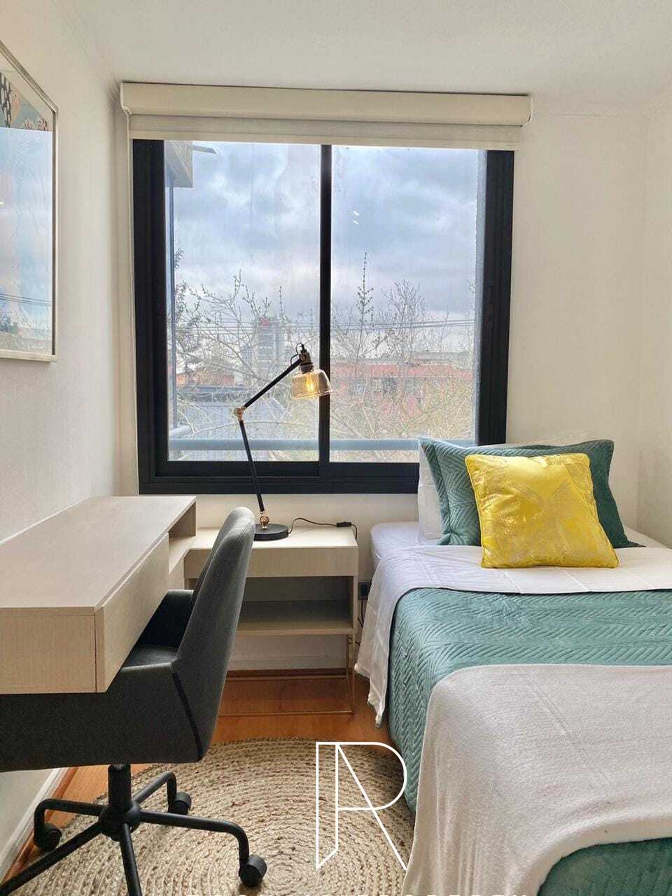 - Segundo dormitorio: cama individual, área de trabajo y baño privado.